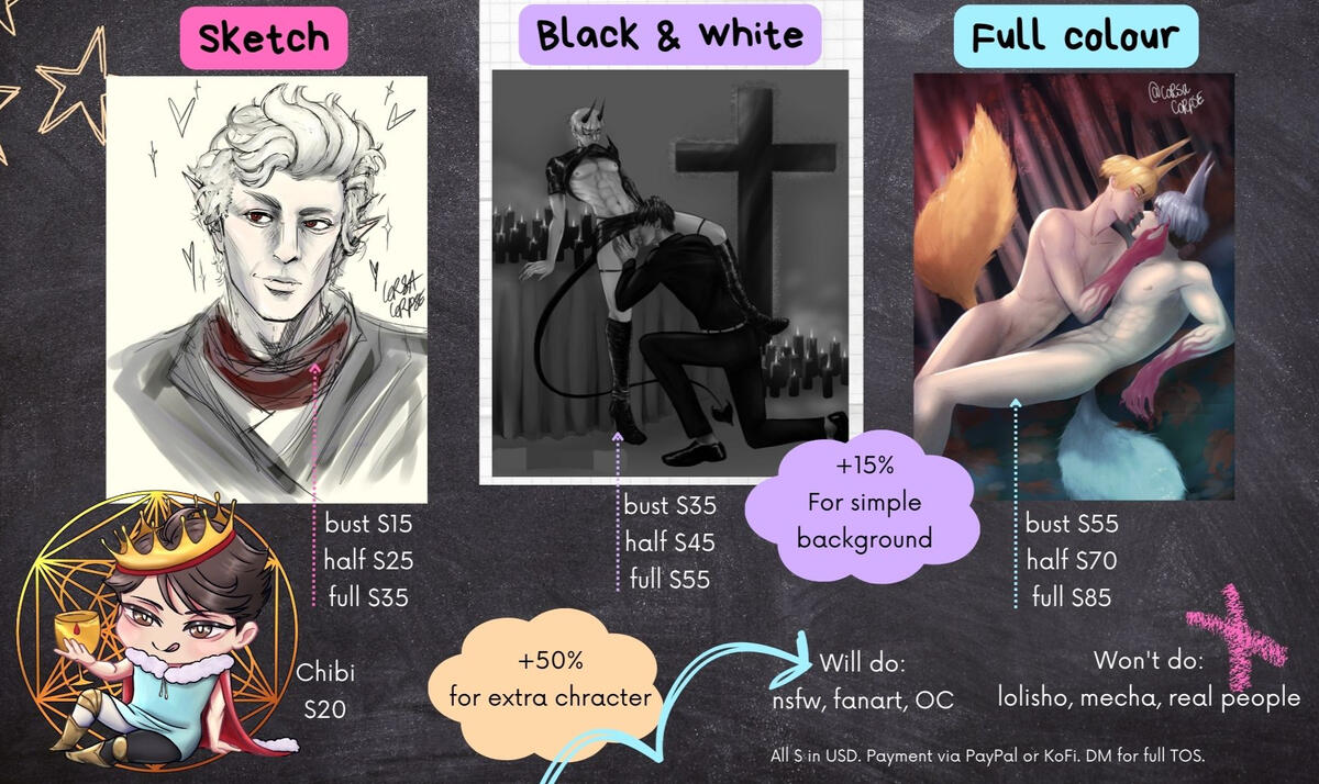 | Chibi | $20 | Extra character +50% | Simple background +15% |